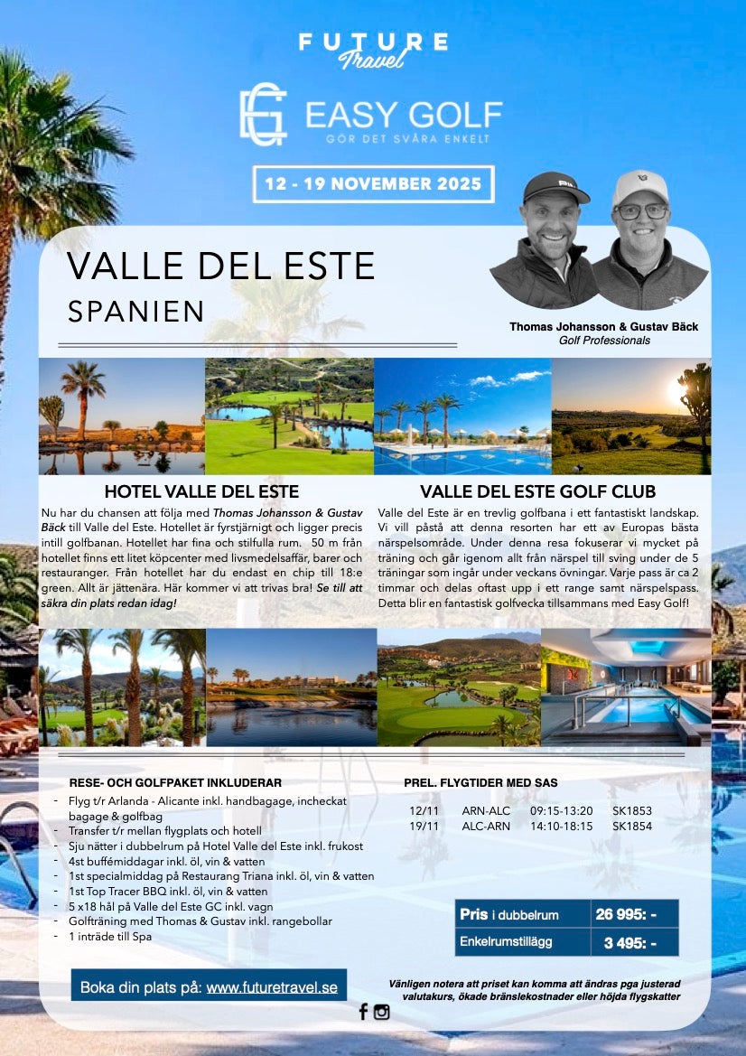 Nu har du chansen att följa med Thomas Johansson & Gustav Bäck till Valle del Este. Hotellet är fyrstjärnigt och ligger precis intill golfbanan.